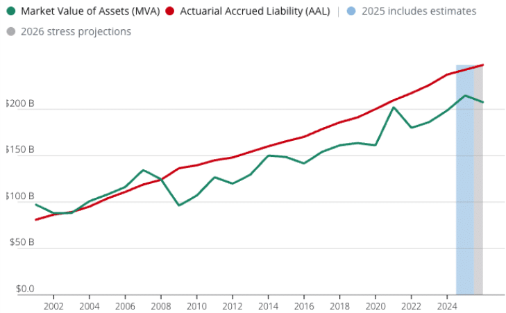 Another major recession would also significantly derail the system. Reason Foundation’s modeling indicates that an investment loss in 2026 similar to that of 2009 (a 20% loss) would result in a funding ratio of 62%, and it would take 15 years just to climb back to today’s funding levels. The full funding date would extend well beyond 2055 in that scenario.